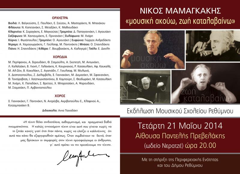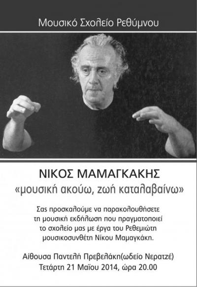 Ο διευθυντής του Μουσικού Σχολείου Ρεθύμνου Αντώνης Γεβετζής, με αφορμή την εκδήλωση για τον Νίκο Μαμαγκάκη, δήλωσε στα «Ρ.Ν.»: «Ο Νίκος Μαμαγκάκης ήταν Ρεθεμνιώτης, ένας πάρα πολύ σημαντικός και σπουδαίος συνθέτης, παγκόσμιας εμβέλειας. Έτσι εμείς ως Μουσικό Σχολείο έπρεπε να διοργανώσουμε μια εκδήλωση τέτοια που να παρουσιάσουμε κάποια από τα τραγούδια του κι έτσι με αυτό τον τρόπο να τιμηθεί το σχολείο μας. Θεωρούμε ότι είναι τιμή μας να παρουσιάζουμε κάποιο από το έργο του, δηλαδή η τιμή προς τον συνθέτη αντανακλά στο σχολείο μας».